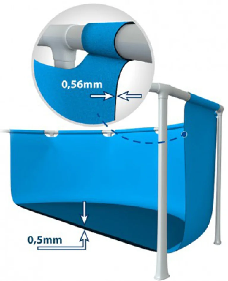 Diseño: fabricada en color azul, con tejido resistente de tres capas laminadas de PVC-Poliéster que aportan mayor firmeza y resistencia, estructura metálica con barras de acero con acabado epoxi antióxido